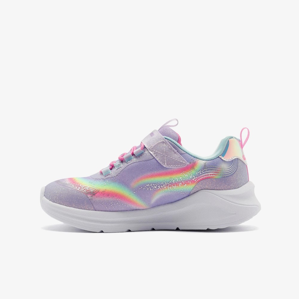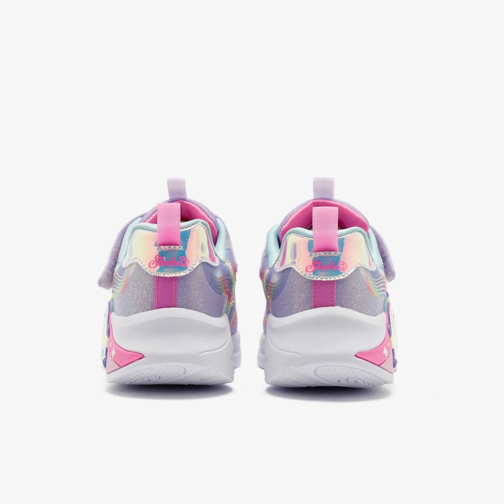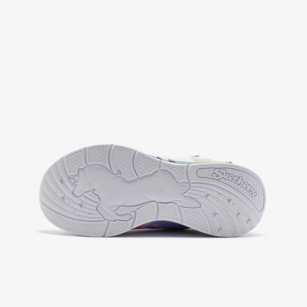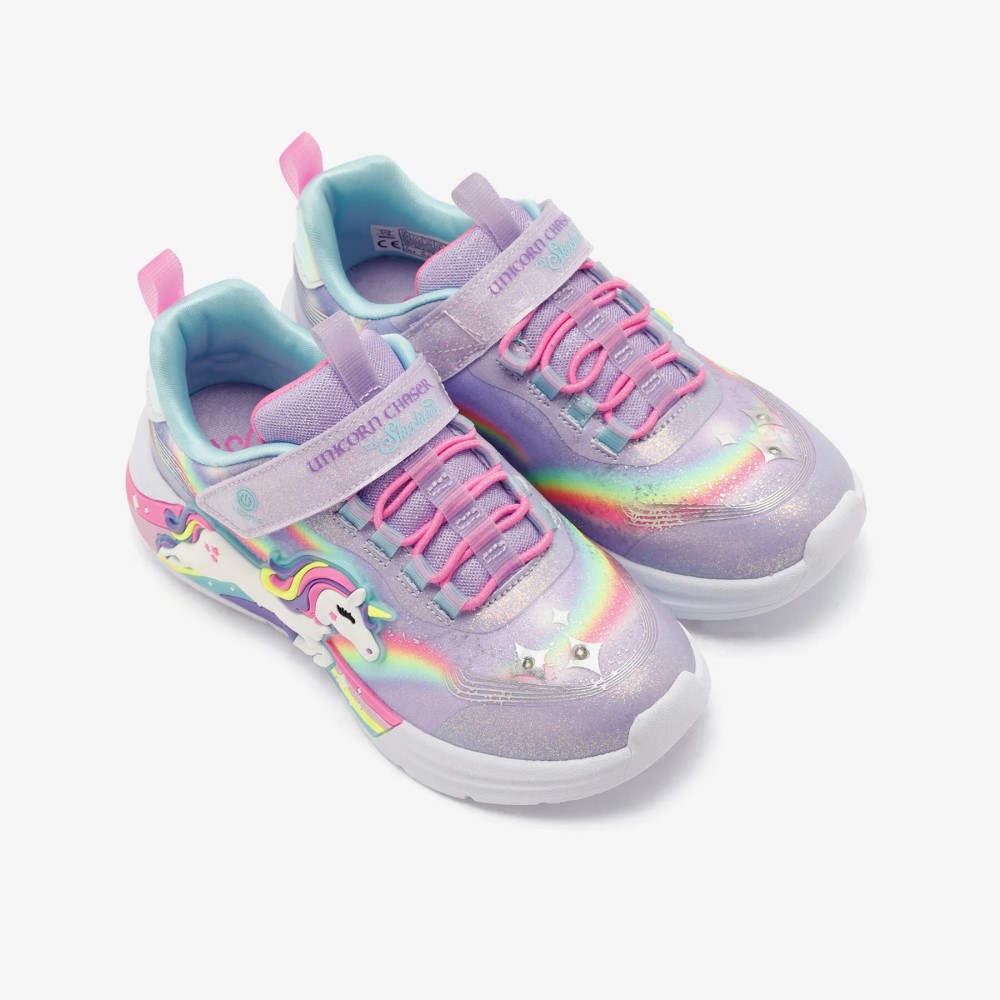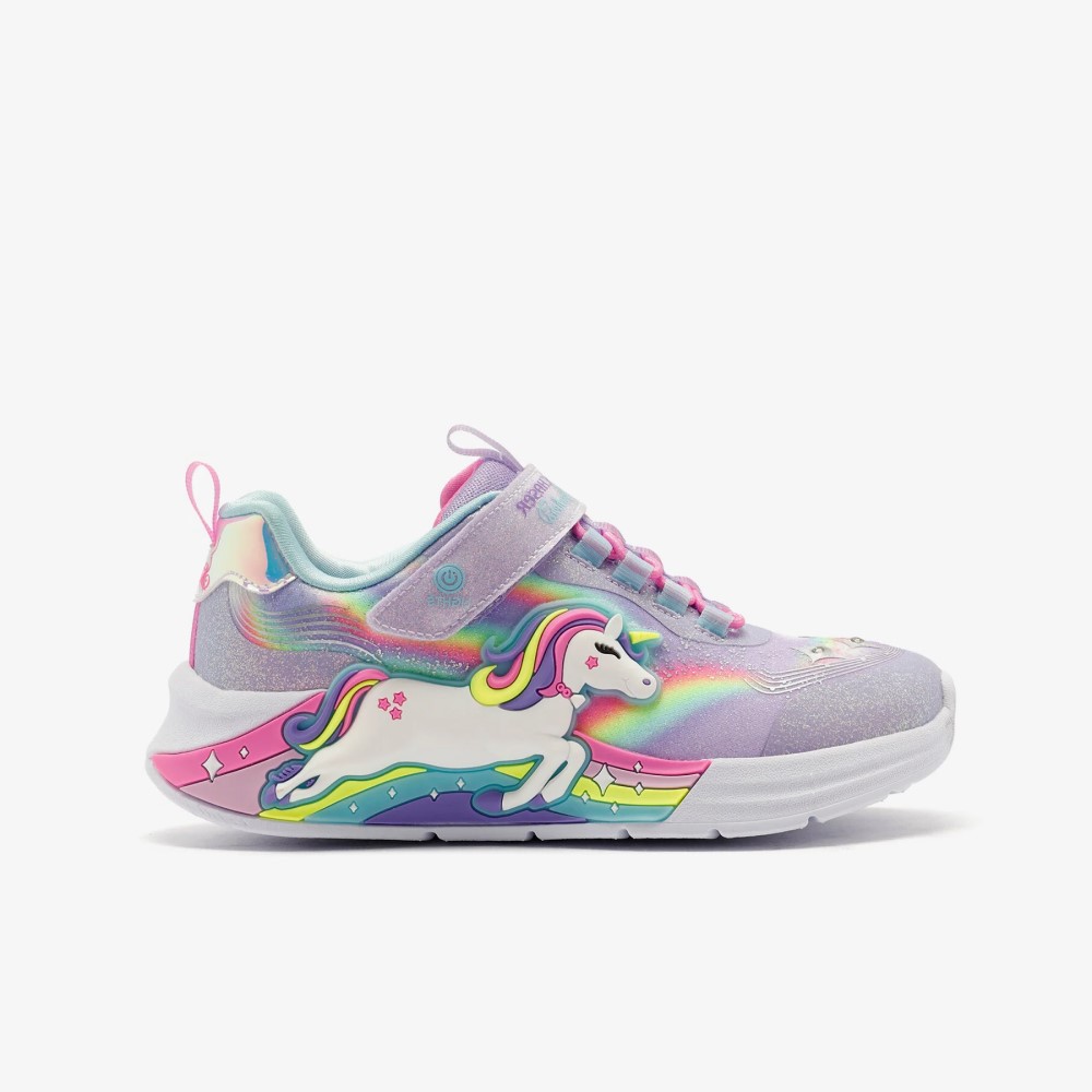 Brilla y resplandece con estilo con las Skechers S-Lights® Unicorn Chaser. Este diseño deportivo iluminado de la Colección Magical® presenta una parte superior con acabado sintético brillante con un gráfico de unicornio y arcoíris en los laterales, cordones elásticos, correa ajustable en el empeine y una plantilla acolchada y cómoda.
