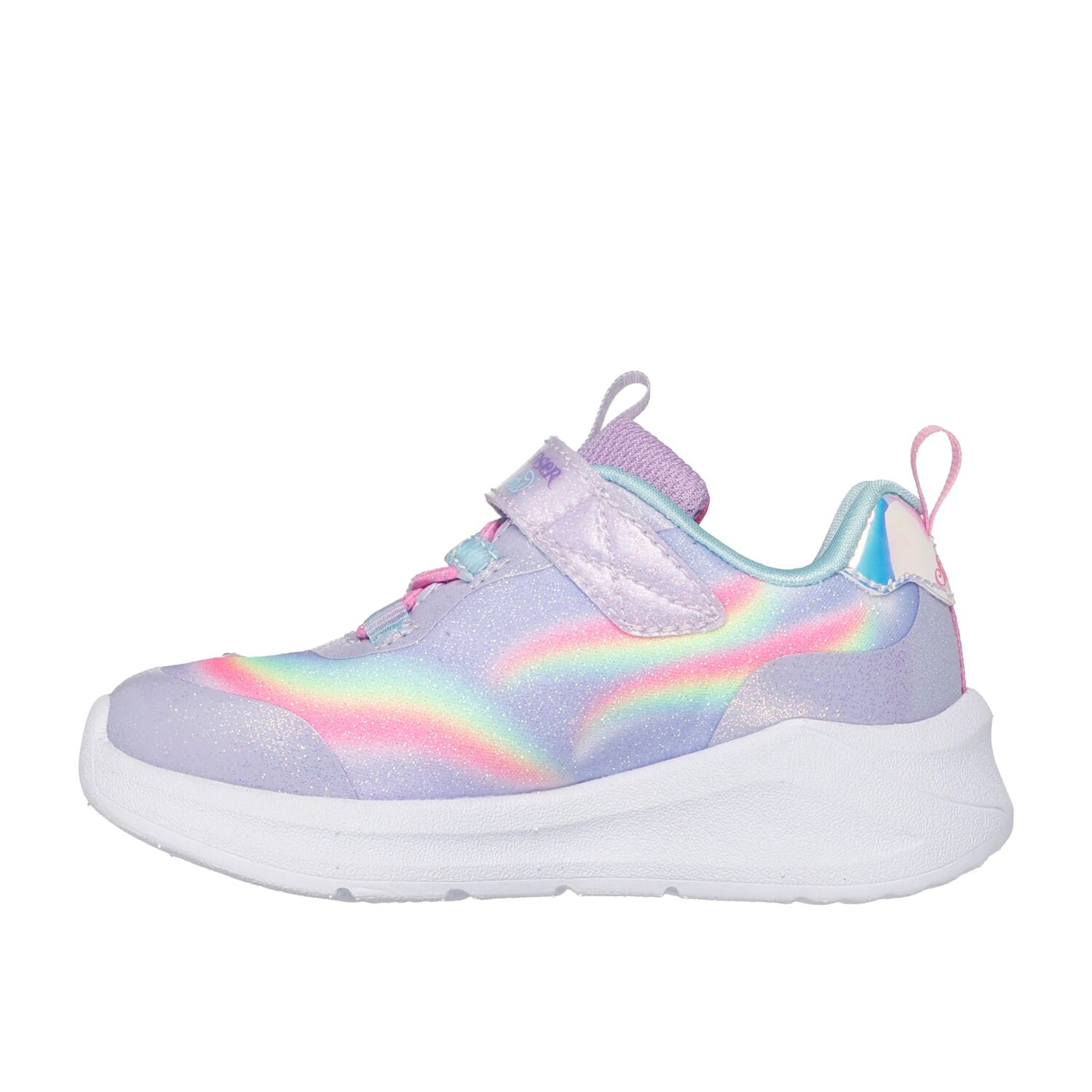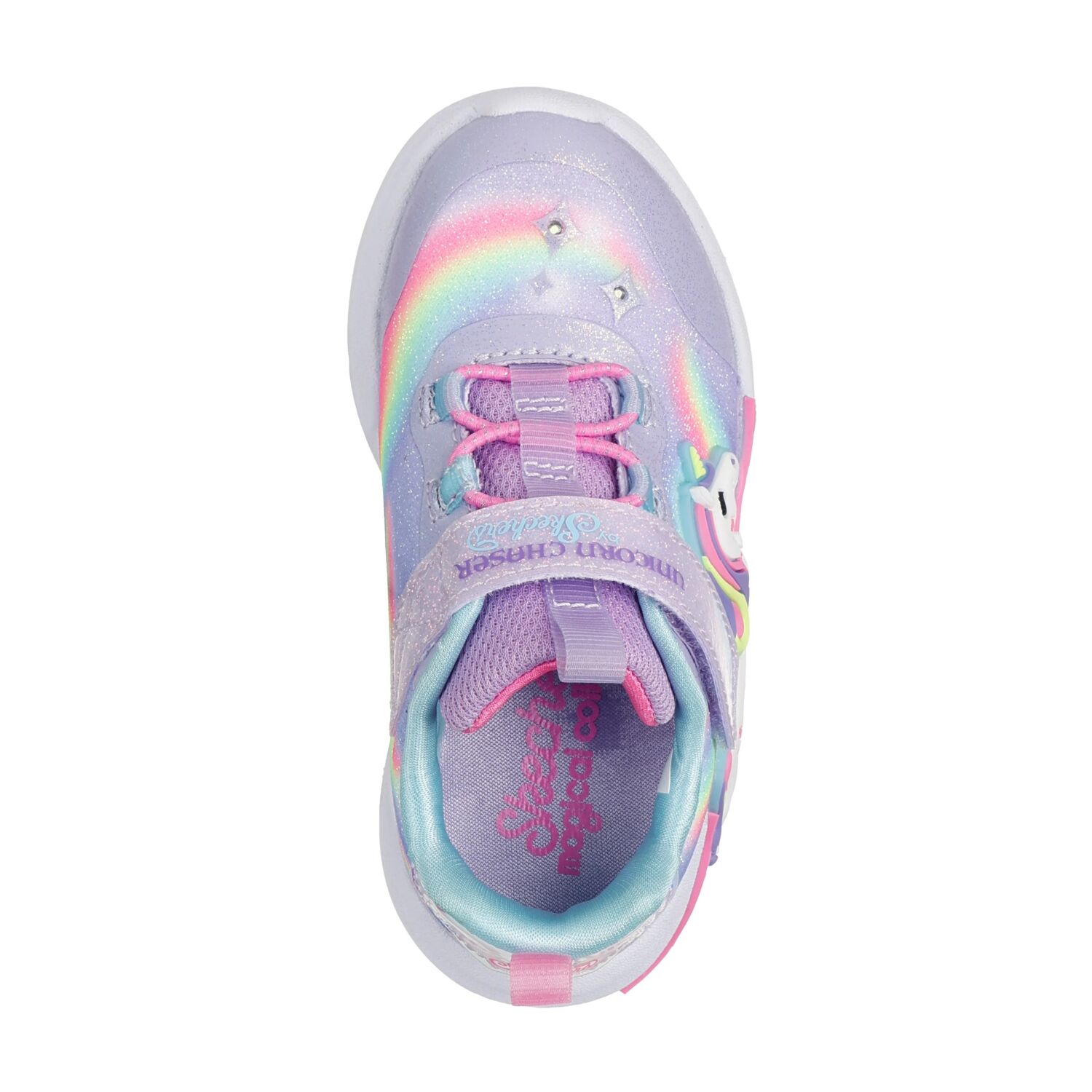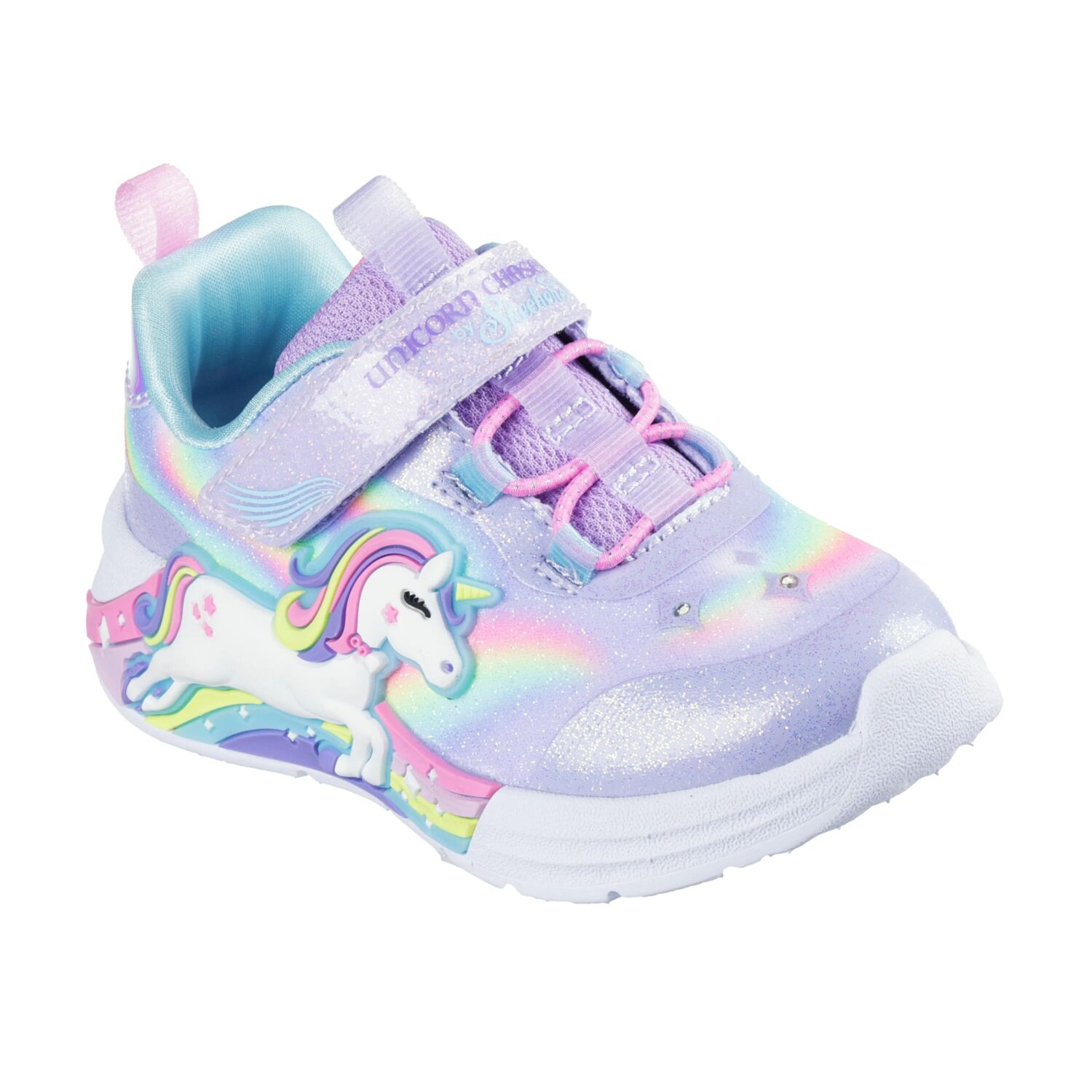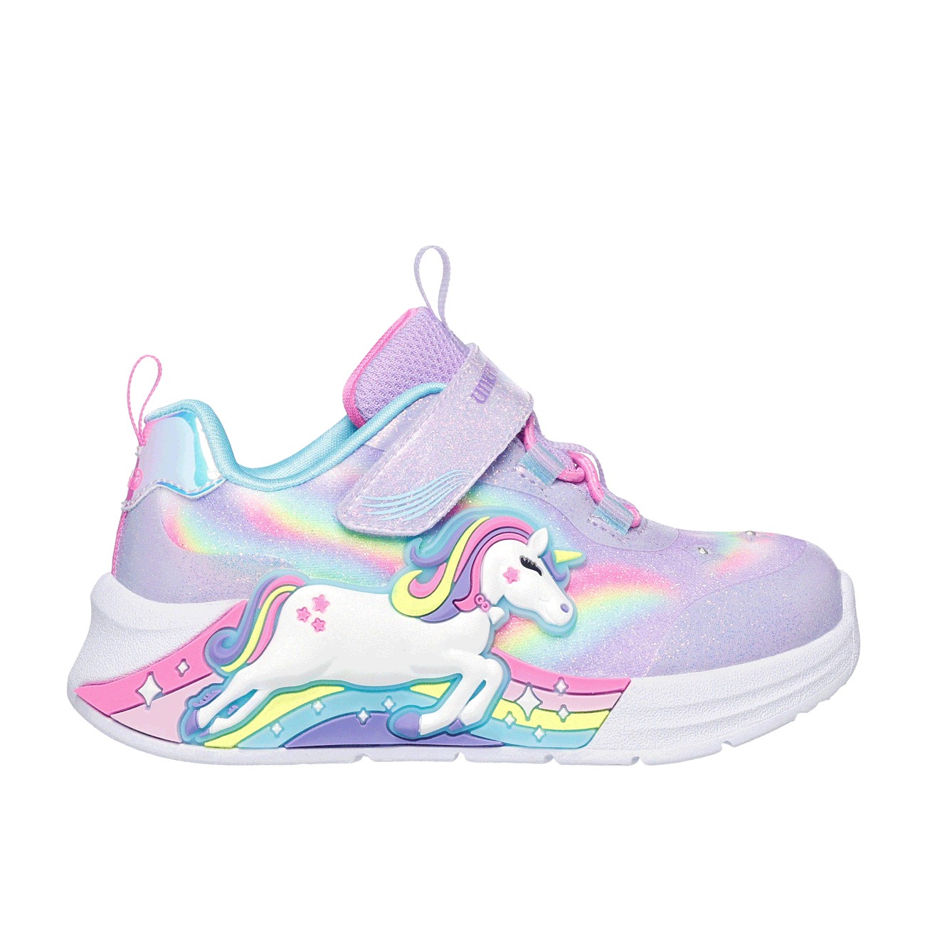 Deslumbra y derrocha estilo con Skechers S-Lights® Unicorn Chaser. Este modelo deportivo con luces de Magical Collection® cuenta con una parte superior sintética con acabado de purpurina y un estampado de un unicornio y un arcoíris en el lateral, cordones elásticos, correa ajustable en el empeine y una cómoda plantilla con amortiguación. Con un regalo por la compra.